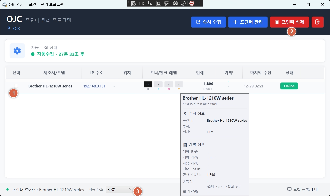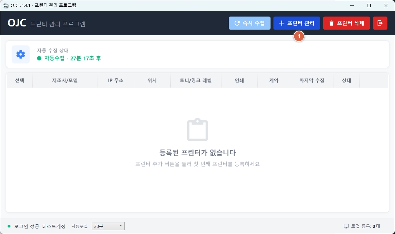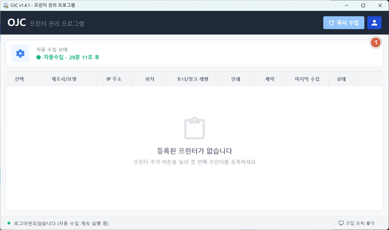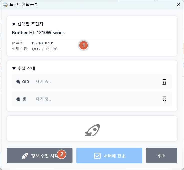 프린터에 따라서 oid 수집이 안되는 경우는 서버 전송이 안되니, 취소 후 게시판에 모델명과 증상을 알려주시면 최대한 빨리 해결하겠습니다.