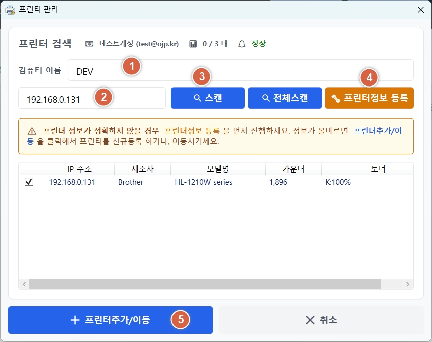 4.프린터 리스트에 나온 프린터의 정보가 맞지 않을경우 프린터 정보등록을 눌러 프린터정보를 서버에 전송시킵니다.