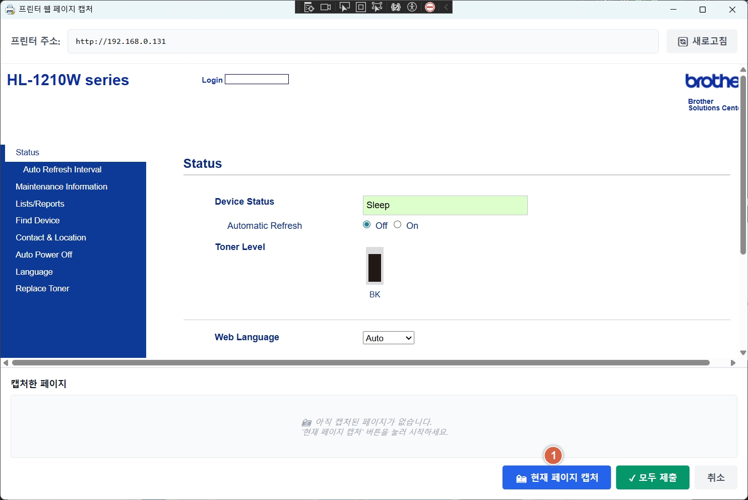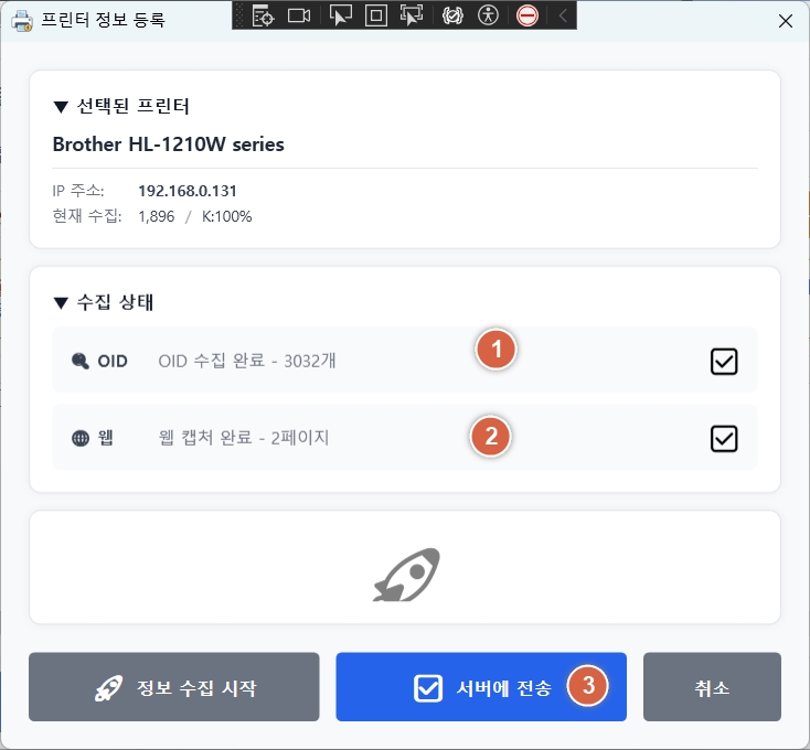 정확한 OID 분석을 위해 프린터 자체 웹 설정 화면을 캡처하여 서버로 전송할 수 있습니다.