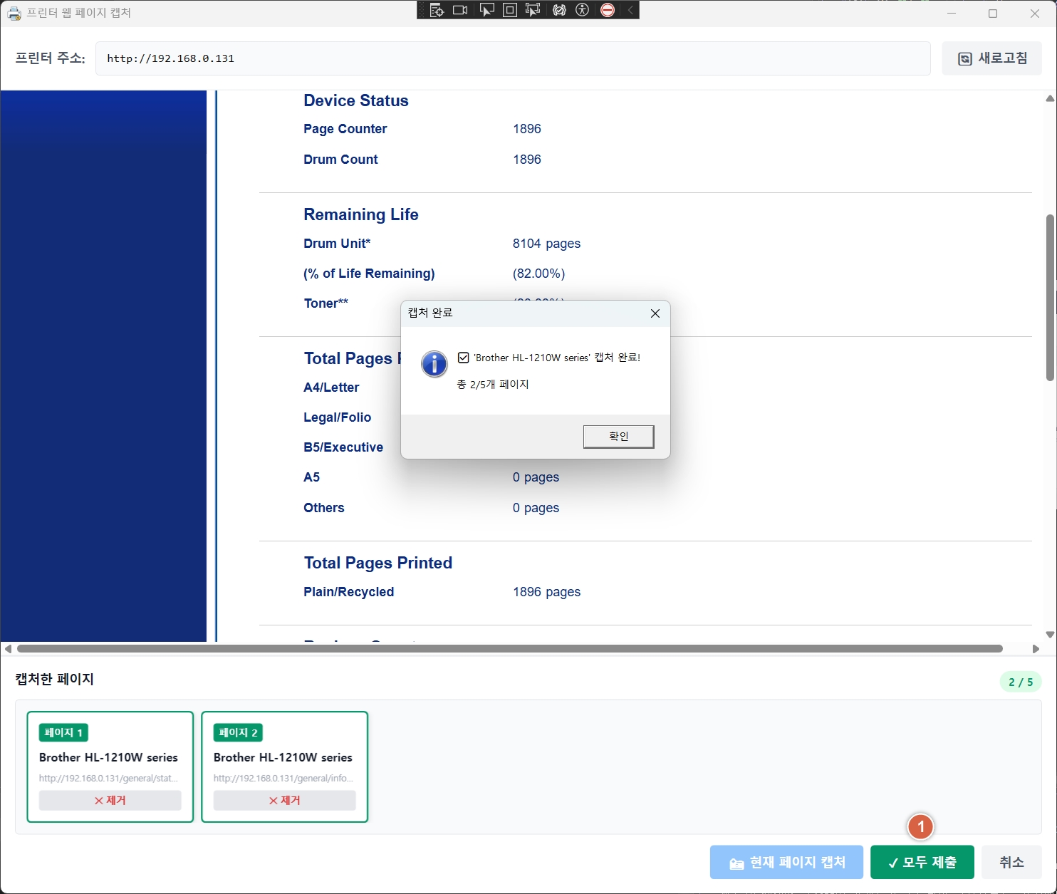 프린터의 잉크잔량이나, 카운터가 표시된 페이지로 이동한후 현제페이지캡처를 눌러 캡처를 합니다.
