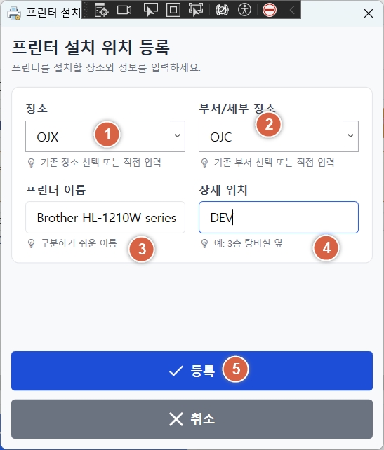 장소,부서,프린터이름, 상세위치를 넣은후 등록 합니다. 장소의 경우 등록을 하면 거래처로 등록이 됩니다. 웹페이지 에서 상세 정보를 입력 하시면 됩니다.